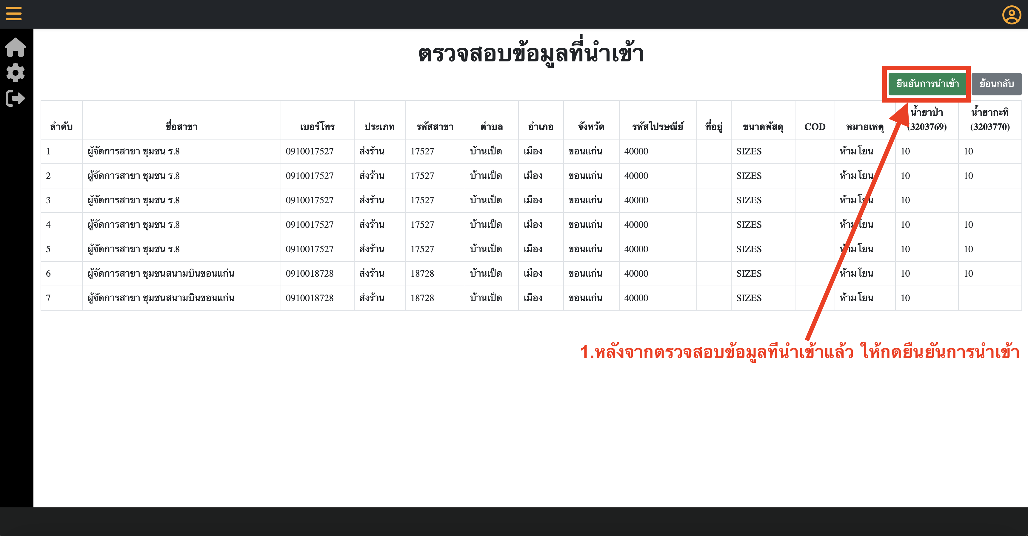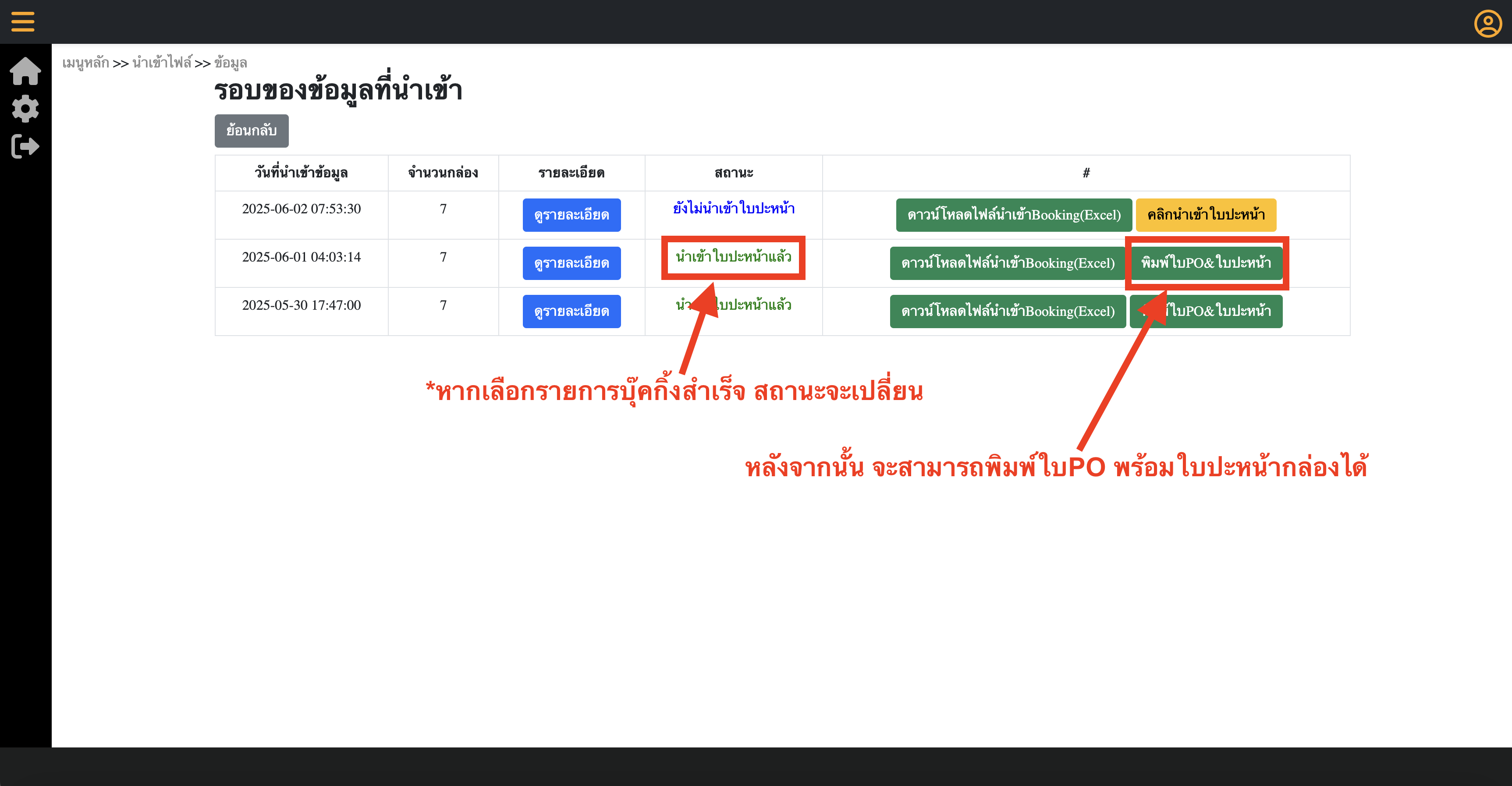 6.หากนำเข้าใบปะหน้าสำเร็จ สถานะรายการจะเป็น นำเข้าใบปะหน้าแล้ว และจะสามารถพิมพ์ใบPO และ ใบปะหน้ากล่องได้