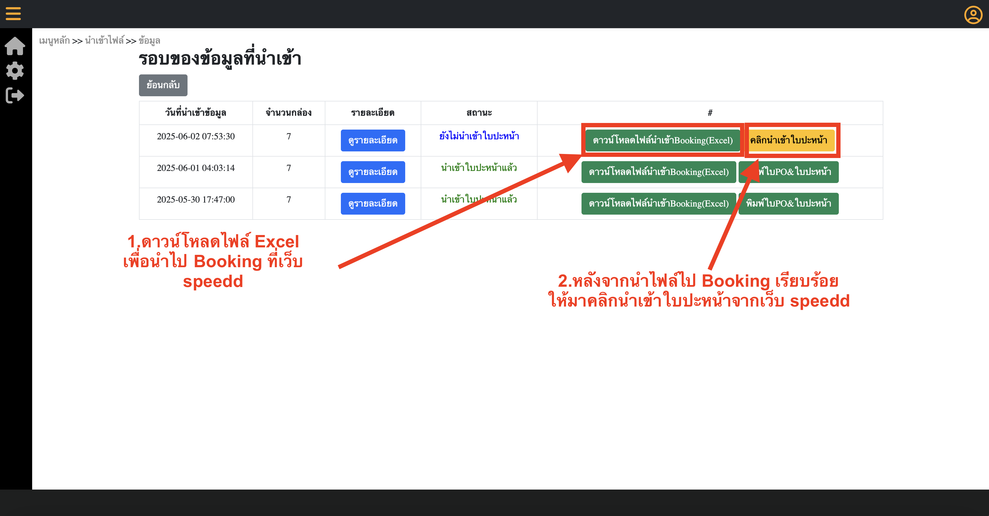 3.หลังจากยืนยันการนำเข้าไฟล์แล้ว ให้มาดาวน์โหลดไฟล์ Excel สำหรับนำไป Booking ส่งของที่เว็บ SpeedD และหลังจากนำไฟล์ Excel ไป Booking เรียบร้อยแล้ว ให้มาคลิกนำเข้าใบปะหน้าที่ปุ่มเหลืองๆตามภาพตัวอย่างด้านล่าง