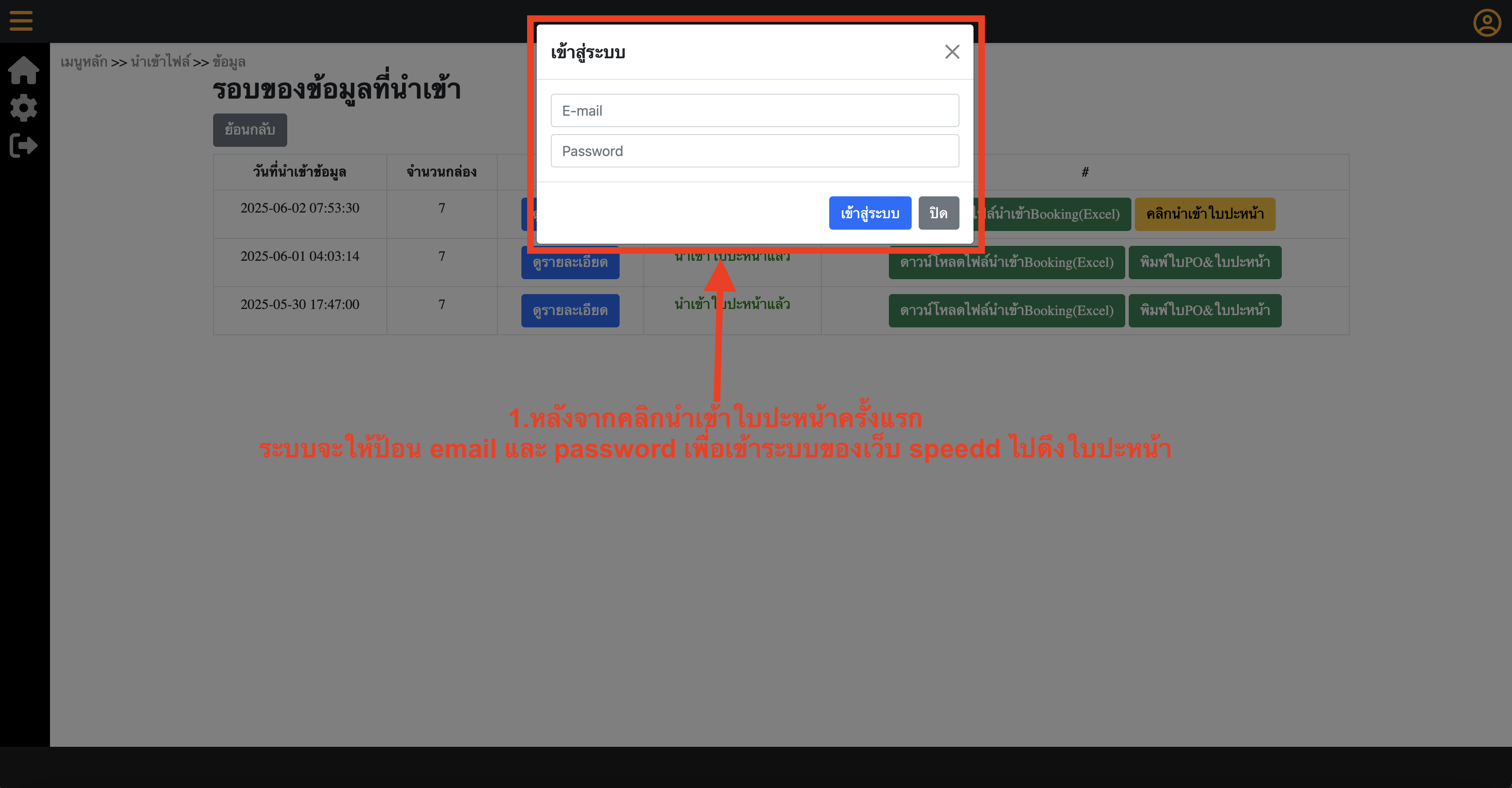 4.หลังจากคลิกนำเข้าใบปะหน้าครั้งแรก ระบบจะให้ใส่ Email และ Password เพื่อเข้าระบบของ SpeedD ไปดึงข้อมูลรายการบุ๊คกิ้ง