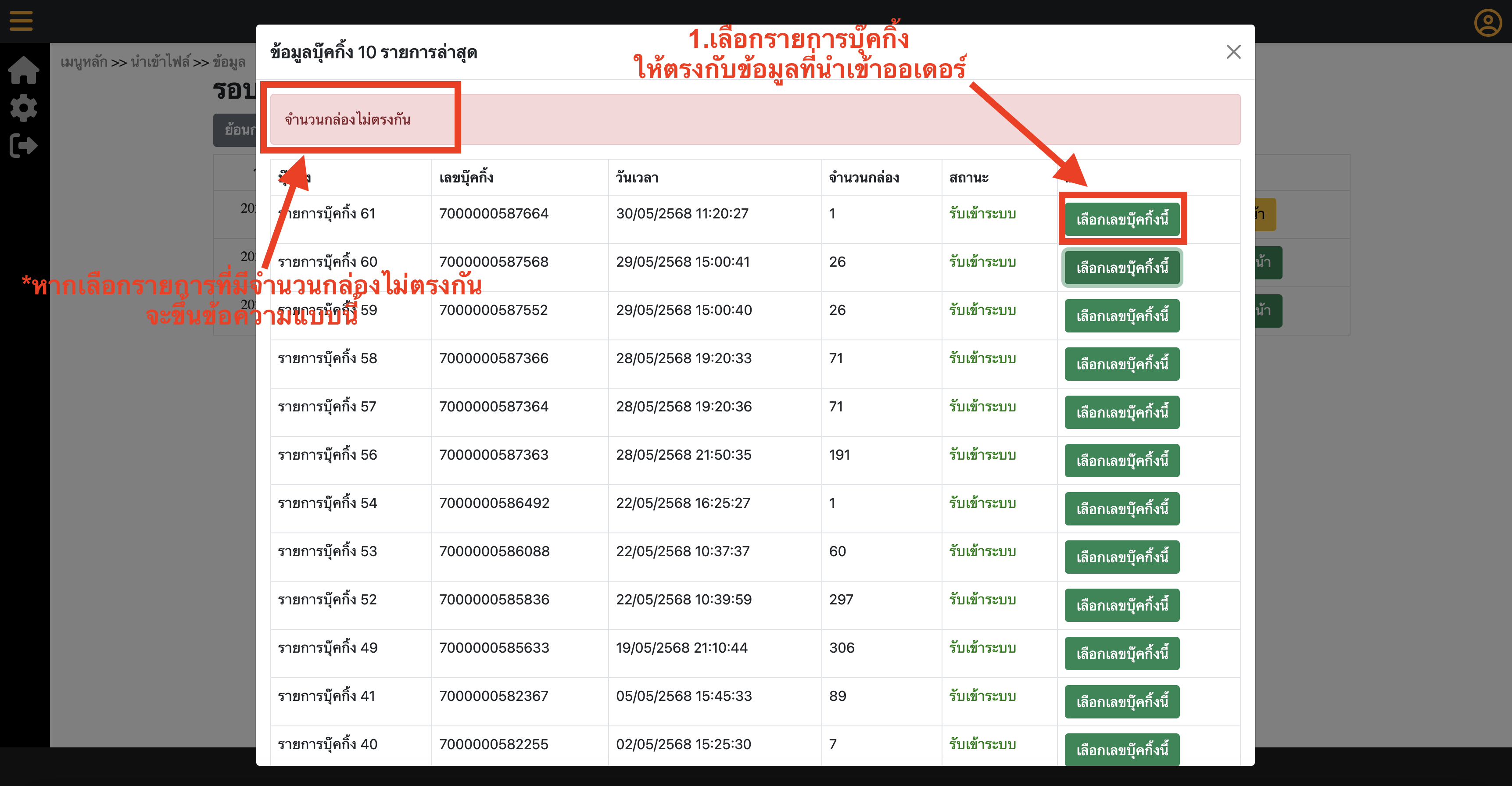 5.เมื่อเข้าสู่ระบบสำเร็จ ระบบจะให้เลือก รายการบุ๊คกิ้งที่จะดึงใบปะหน้า(ต้องเลือกรายการบุ๊คกิ้งที่มีจำนวนกล่องตรงกับข้อมูลที่นำเข้าก่อนหน้านี้) หาจำนวนกล่องไม่ตรงกัน จะไม่สามารถดึงใบปะหน้ามาได้ (แบบภาพตัวอย่างด้านล่างนี้)