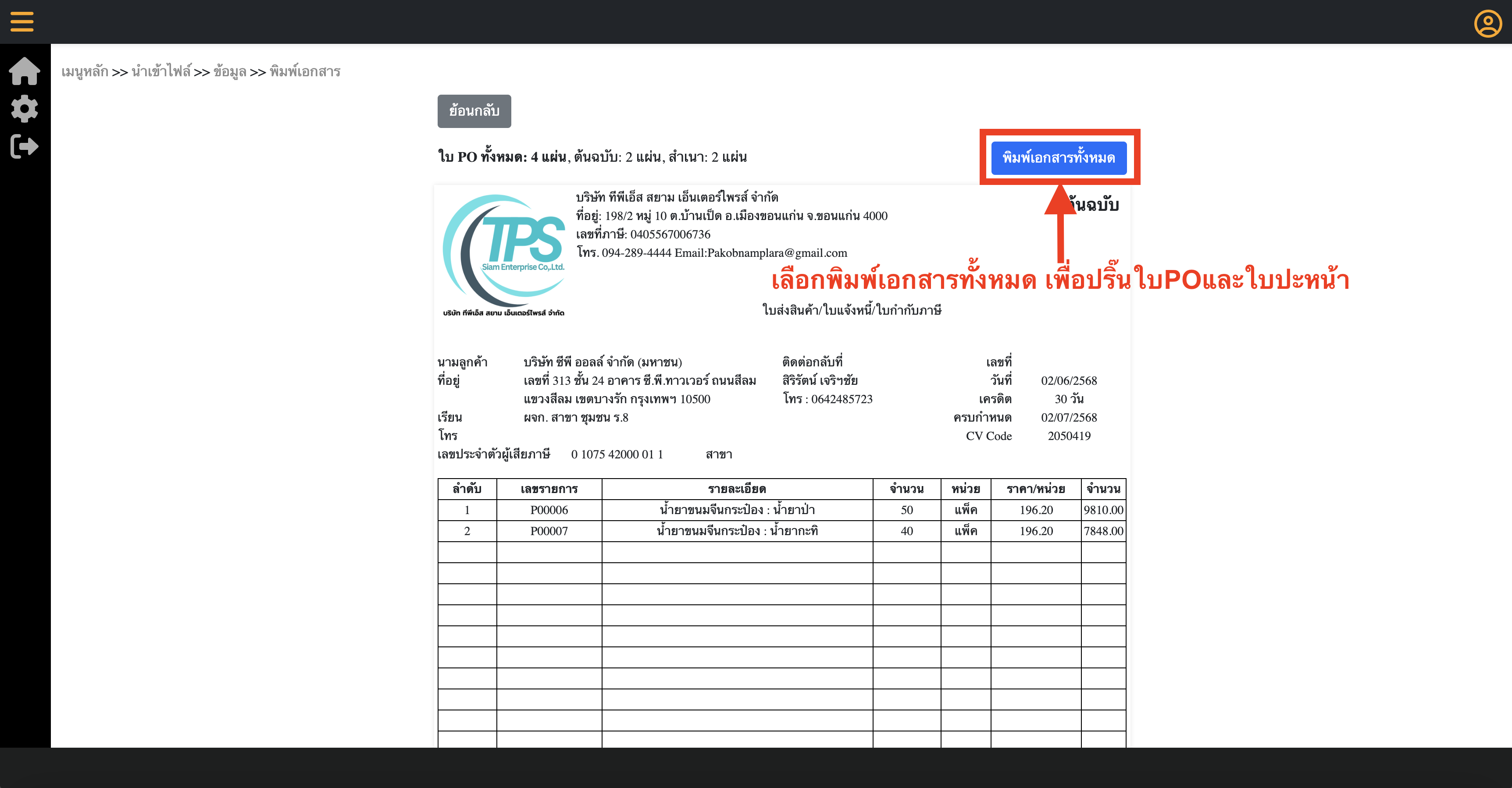 7.คลิกที่ปุ่ม "พิมพ์เอกสารทั้งหมด" เพื่อปริ๊นใบPO และ ใบปะหน้าออกทางเครื่องพิมพ์